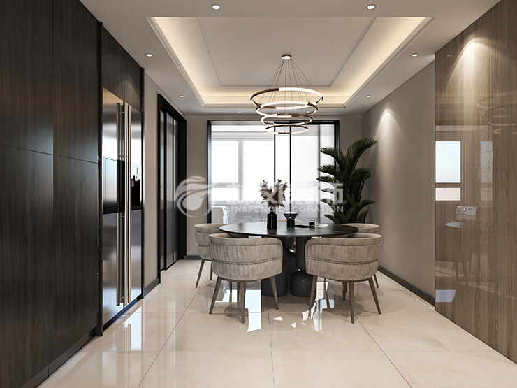 恒大華府180平4居室現(xiàn)代輕奢風(fēng)格林鳳裝飾的餐廳業(yè)主希望擺置一張圓桌,象征合家團(tuán)圓的美好愿景,在添置圓桌的基礎(chǔ)上使用圓形吊燈與之相呼應(yīng),棚頂?shù)孛嫦噍o相成;在廚房外合理運(yùn)用定制做出暗藏冰箱的柜面設(shè)計(jì),充分利用空間的同時(shí)又巧妙避免了冰箱露出側(cè)面的尷尬。