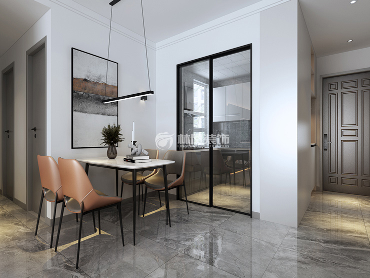 富禹盛京學府113平三室兩廳現(xiàn)代混搭風格林鳳裝飾的餐廳采用成品家具,搭配皮質(zhì)餐椅,凸顯餐廳設計