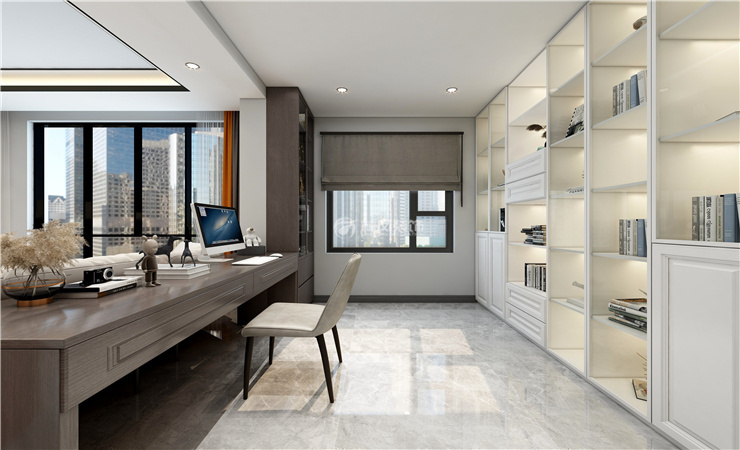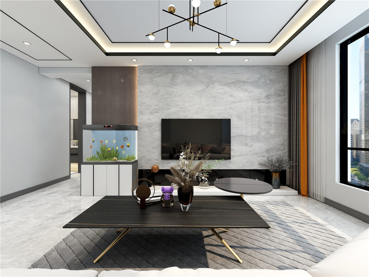 1.客廳和書房的墻體打開使整個空間看起來更寬敞,而且客廳的人和書房的人還能有一個很好的互動。客廳的電視背景墻采用格柵和大理石結合的設計,電視柜采用大理石定制。這樣的設計試整個空間看起來更大氣。