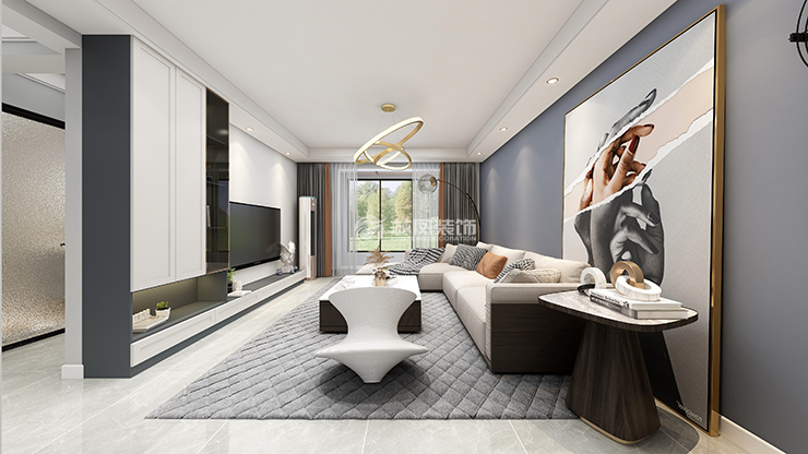 本案客廳整體沒有復(fù)雜的造型,只是在棚面上有一圈邊棚,沙發(fā)背景墻用藍灰色乳膠漆調(diào)色,電視背景墻用組合柜子的形式來代替背景墻,既有裝飾又可以儲物。
