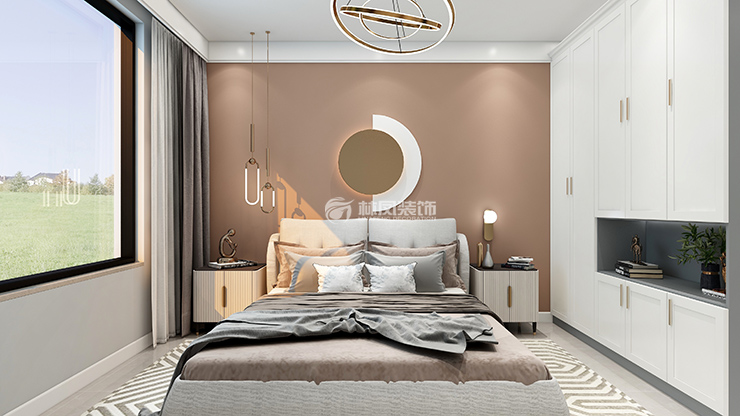 女主人不喜歡繁瑣的東西,整體衣柜上面都沒有吊棚,床頭背景墻選擇的是橡皮粉的乳膠漆進行點綴。