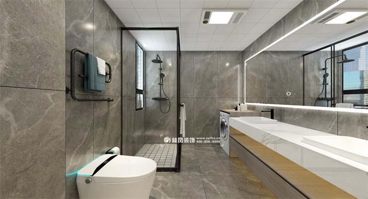 主臥衛(wèi)生間采用雙手盆設計,讓衛(wèi)生間看起來更大氣的同時也滿足了男女主人的使用方便。公共衛(wèi)生間則以實用為主,簡單的色彩搭配使得空間顯得更加大氣。