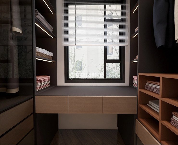 衣帽間說明:柜子整體選用深灰色系局部搭配木色橘色調(diào),使整個空間高級奢華的同時又具有一絲俏皮溫柔,簡單的立面,利落的線條和統(tǒng)一的配色,借材質(zhì)本身的高級感去營造出奢而不華的輕奢韻味。
