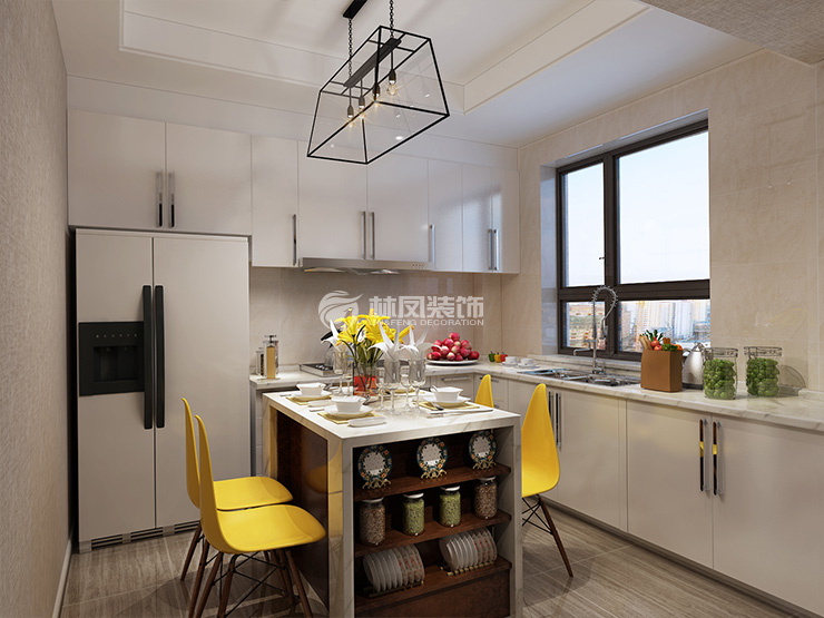 半開(kāi)放式廚房設(shè)計(jì),白色柜體與臺(tái)面,搭配暖色墻磚,讓廚房空間干凈整潔,也讓用餐的人心情愉悅。