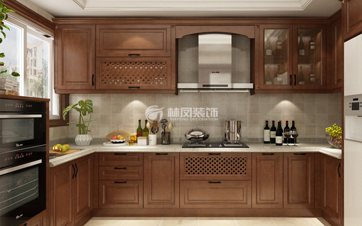 廚房主要以仿古墻磚在搭配實木門板,頗顯出自然風姿,深淺搭配顏色的運用,使整個空間更顯大氣。