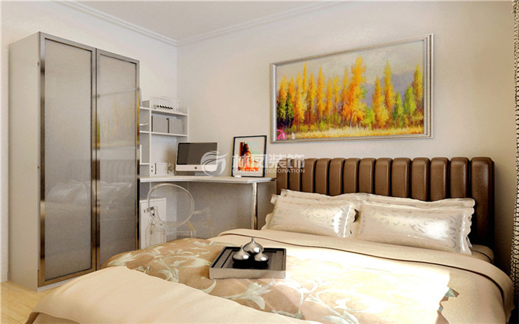 臥室考慮儲藏空間的利用,將衣柜和書柜做成整體,墻面采用白色乳膠漆的臥室渲染出來安靜而溫馨。