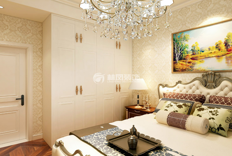 主臥室的色彩沒有延續(xù)的客廳的灰與白,反其道而行的采用了暖色。暖白色的床,暖白色的床單,暖白色的衣柜,與實(shí)木色的床頭柜構(gòu)筑了整體的深淺顏色基調(diào)。暖黃色的壁紙大面積的鋪設(shè)與拼花的地板互為倚靠,互相襯托??傮w感覺還是非常的和諧