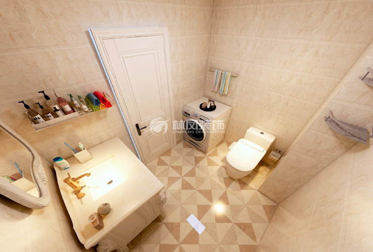 暖色的墻磚搭配拼花的的地磚賦予了空間整潔感,總體的潔具選擇也都是歐式風(fēng)格。白色與暖色的搭配整體不讓人感覺毛糙,卻有讓人感覺舒服。