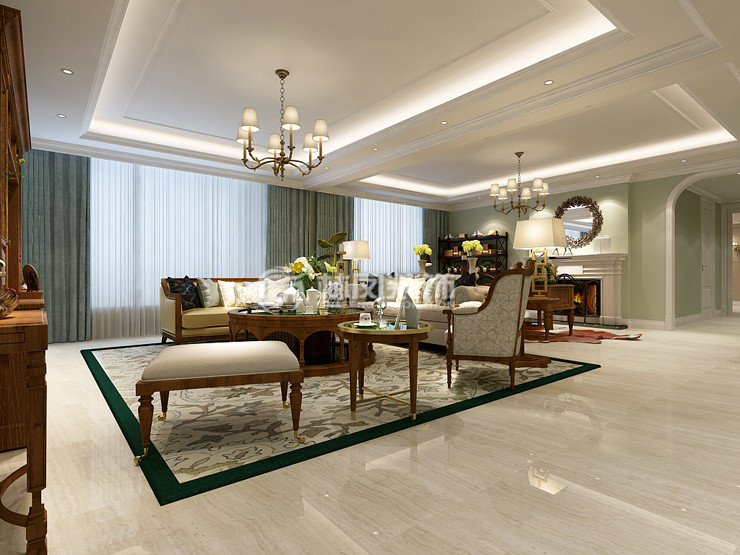 2.客廳作為待客區(qū)域,一般要身心舒適,考慮到客戶本身不喜歡復(fù)雜的吊頂,也為體現(xiàn)簡美的特點,所以選用的簡單的石膏線作為吊頂裝飾,對沙發(fā)背景墻的設(shè)計采用了符合簡美風(fēng)格的掛畫,也結(jié)合了家具選用的彩色布藝沙發(fā)作為呼應(yīng),也創(chuàng)造了自然簡樸的視覺效果,充滿美式元素的客廳讓空間顯得更加華麗,溫馨。