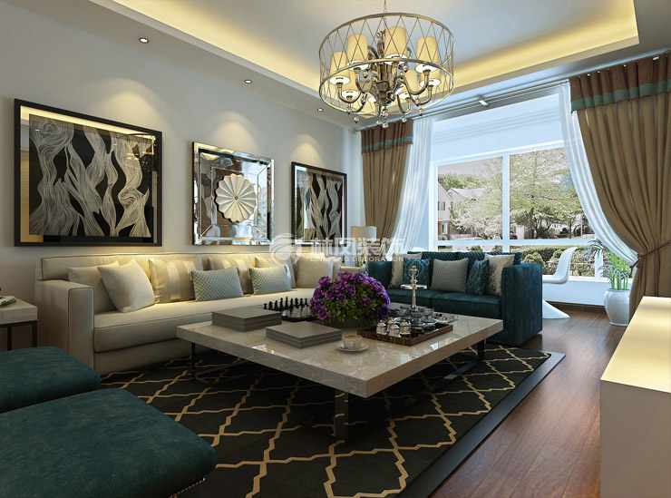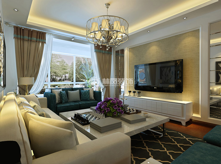 三室兩廳一廚兩衛(wèi),高層整體采用美式風格,色調以深色為主,體現(xiàn)美式的居家感和溫馨感。