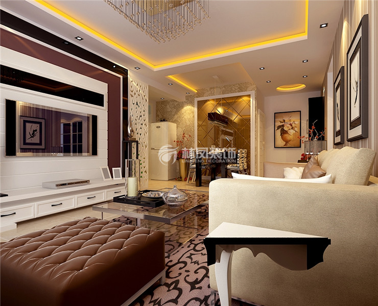 本案客廳選用的是米黃的地磚 配備以咖啡色的壁紙和沙發(fā)布 深淺搭配 用烤漆玻璃突出整個空間的質(zhì)感,客廳的吊棚區(qū)別開空間的區(qū)域,背景墻做了一個延伸,運用的是雕花隔板,視覺上擴大了墻體的長度??蛷d的窗簾是真絲 的純色窗簾和紗簾。