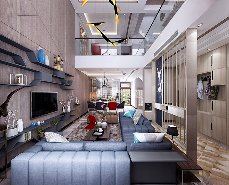 挑空的設(shè)計(jì)使整個(gè)空間通透大氣,通頂?shù)脑旧娨暠尘皦ν癸@設(shè)計(jì)風(fēng)格,金屬裝飾條的點(diǎn)綴為空間增添些許奢華氣質(zhì)。藍(lán)色沙發(fā)的呼應(yīng)與紅色窗簾的點(diǎn)綴使整個(gè)空間安逸而富有活力。完美詮釋了北歐風(fēng)格的特點(diǎn)。