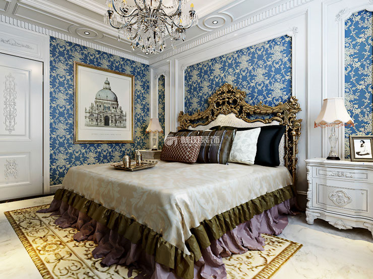 臥室整體以白色為主,雕花的金屬床頭,充分體現(xiàn)法式風(fēng)格的貴族氣息,用深色的抱枕來調(diào)節(jié)空間的對(duì)比性,散發(fā)著濃郁的法式古典氣息。