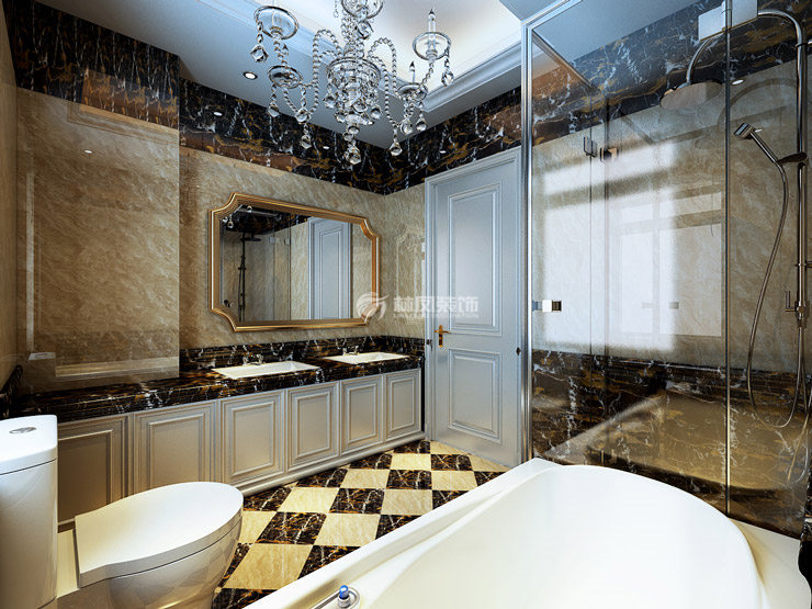 衛(wèi)生間要給人寬敞舒適的感覺,空間也足夠大,可以把浴屏和浴缸同時(shí)放入,也解決了給小孩洗澡的問題,雙人手盆和寬大的鏡面給人一份擴(kuò)容感,在奢華中展現(xiàn)了時(shí)尚的前衛(wèi)。
