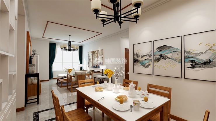 客廳空間比較合理,地面上客廳和餐廳的分割部分做了波打線,在頂棚裝飾運(yùn)用了實(shí)木線條,背景墻上定制了無妨壁畫,來詮釋中式意境和淡雅,