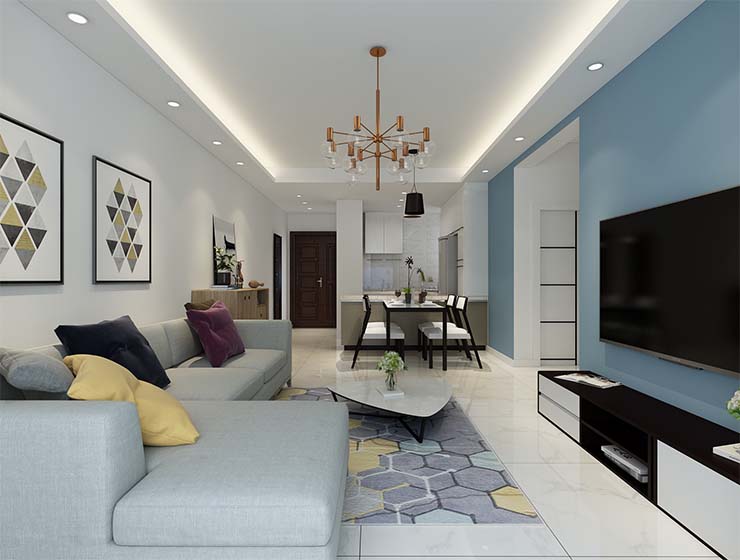 客廳棚墻面主要運(yùn)用乳膠漆調(diào)色來(lái)成為整個(gè)區(qū)域的亮點(diǎn),吊頂?shù)闹本€邊棚是整個(gè)空間更加寬敞立體,掛畫(huà)的顏色里包含了所有的背景色,加大了空間的視覺(jué)效果,整體的客廳大氣又舒適。通過(guò)室內(nèi)家具簡(jiǎn)單富有內(nèi)容的色彩打造現(xiàn)代風(fēng)格一種樸素、清新的原始之美的氣氛,