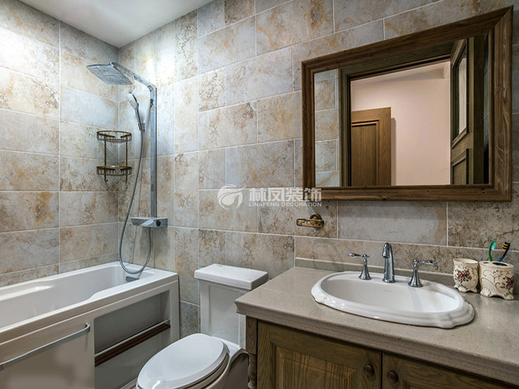 巖石瓷磚加工的尺寸極具特色、浴室柜的選擇和潔具的選購都與墻面瓷磚相得益彰、棚頂也是大氣的防水石膏板吊頂 。
