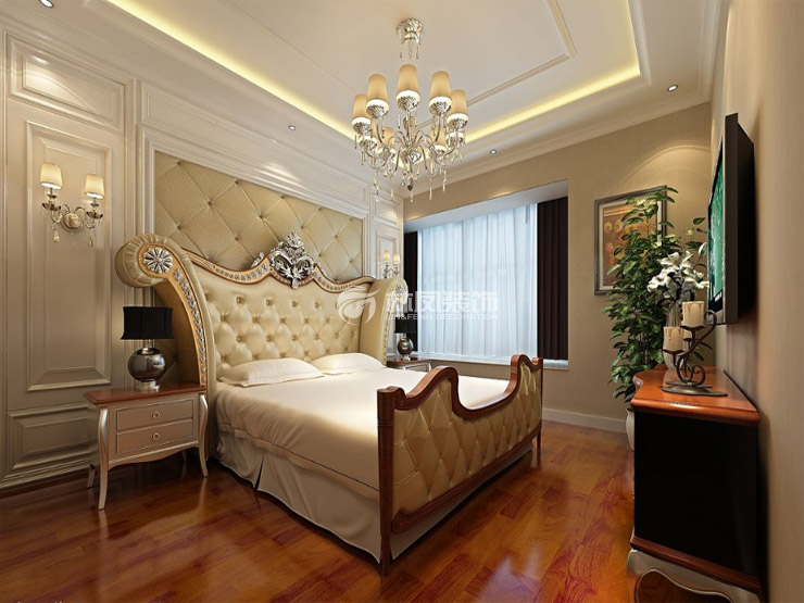 主臥室采用深色地板,床頭背景采用象牙白墻板的設計高貴大氣,內嵌的軟包造型出與線條,床品的顏色也和窗簾配飾相呼應。棚面采用邊棚和歐式石膏線相結合,并采用筒燈和燈帶增加氛圍光。