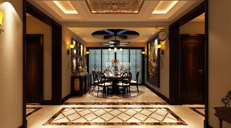 餐廳開(kāi)間與客廳同寬,是這個(gè)戶型最大的優(yōu)點(diǎn),棚面根據(jù)餐桌形狀做成圓形吊棚,內(nèi)安實(shí)木梁與實(shí)木餐桌呼應(yīng)。墻面用大幅油畫(huà)和壁燈裝飾。