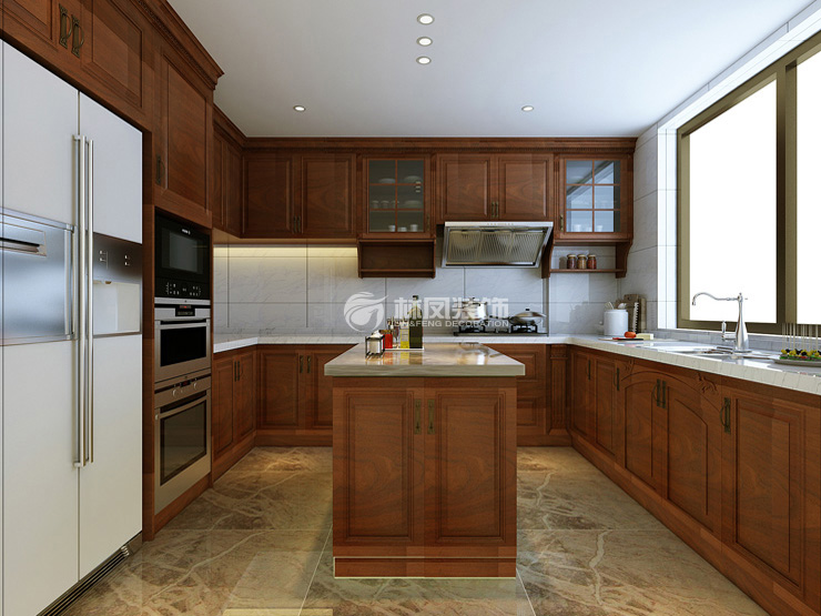 廚房整體設(shè)計思路還是遵照人體工程原則、操作流程原則、采光通風(fēng)原則。中間島臺的設(shè)計使得原本中規(guī)中舉的櫥柜更顯高端、大氣更有品味。